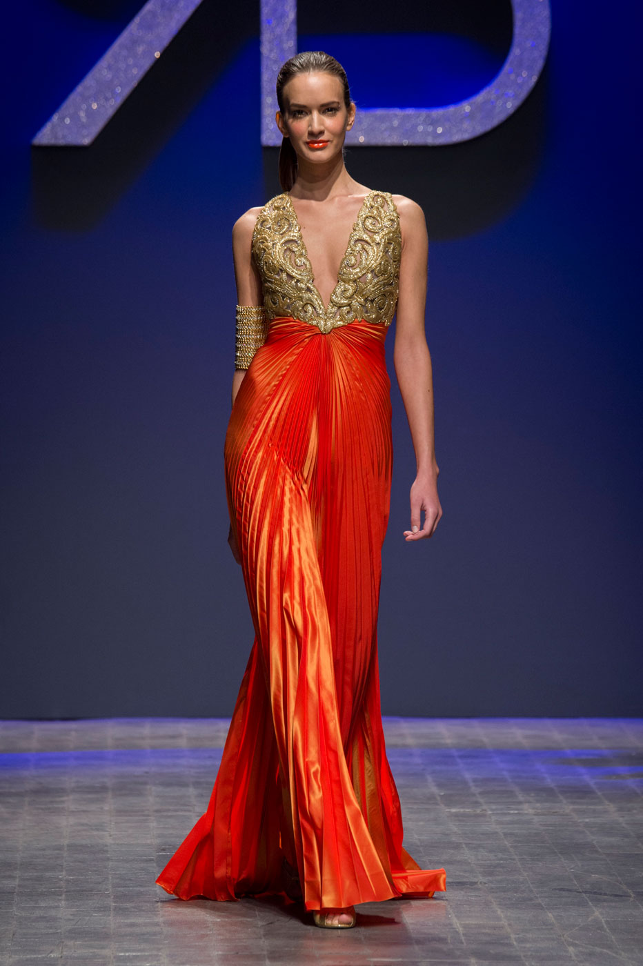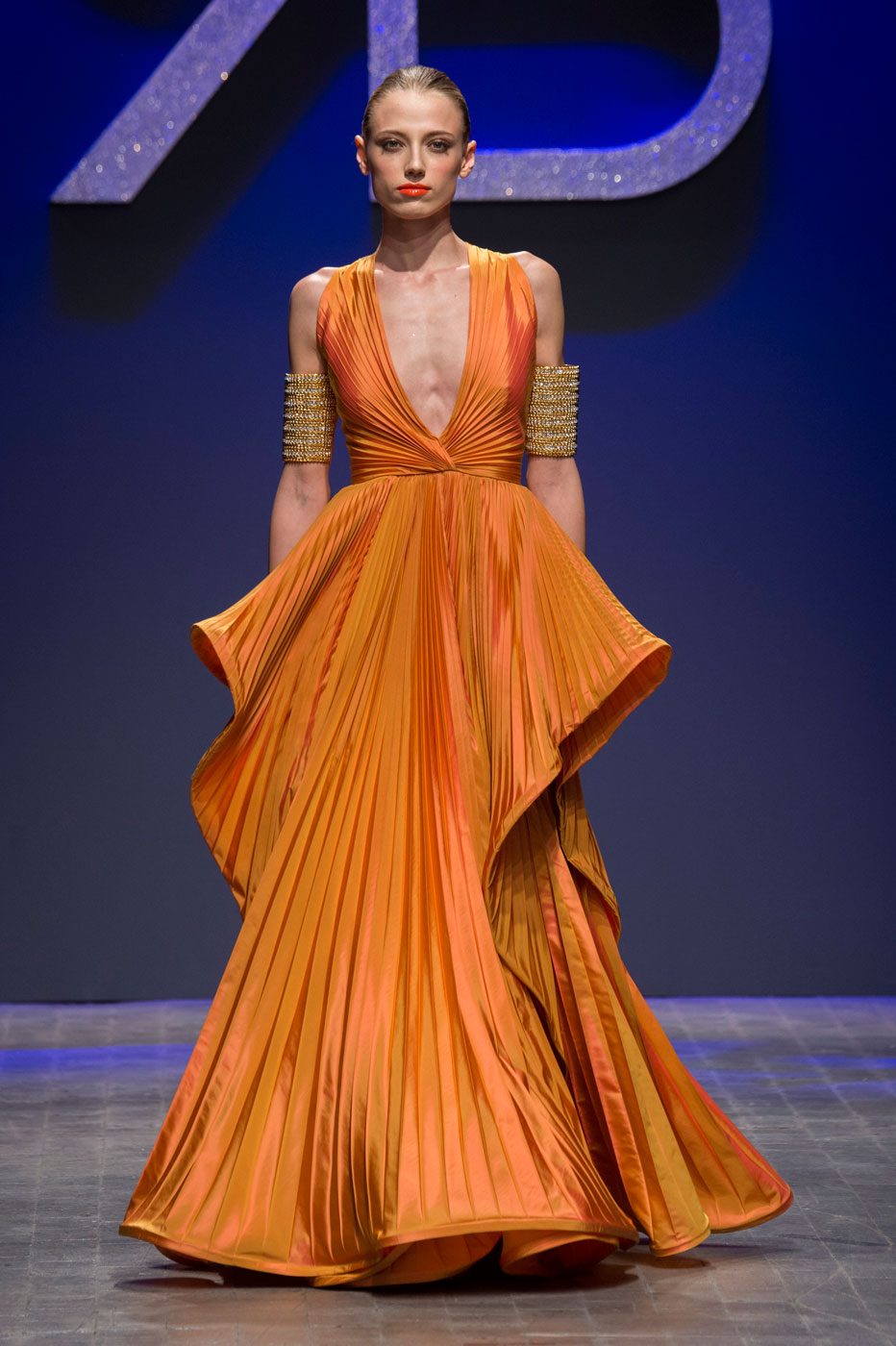 Tagli sublimi, cuciture magistrali, forme e silhouette da manuale: autentici capolavori di stile per il couturier della Dolce Vita che parte da un'ispirazione legata alla Magna Grecia, con abiti peplo color bianco polvere, con pannelli laterali, lunghe sciarpe in seta che dal collo volano leggere segnando importanti strascichi, bracciali dorati molto importanti, lunghi e portati sopra il gomito e ricami scintillanti degni, per l'appunto, per una dea dell'Olimpo, una dea nuova, scesa in Terra, a Roma precisamente per dimostrare quanto si può essere divine con indosso l'abito couture giusto. Tutto è fluido e morbido e dopo la Magna Grecia si passa con armonia a una serie di abiti dalle stampe arancio degradé che sono un autentico spettacolo per gli occhi: il sole al tramonto con i suoi colori fiammeggianti disegna long dress drappeggiati che osano spacchi vertiginosi sul retro e sul davanti e, in qualche modello, anche centrali. Spacchi, naturalmente, molto studiati, che nulla hanno di volgare, anzi servono ad esaltare sia il capo che le forme di chi li indosserà con elegante nonchalance. Che scrivere di tutti i capi realizzati in plissè soleil se non che hanno dimostrato quanto sia bella e viva l'alta moda quando è sogno, poesia e compostezza armoniosa di design e pura bellezza? Il plissè soleil, proposto in bianco e nei monocolori orange e giallo quasi ocra, resteranno tra i capi top di questa edizione di AltaRoma. Una menzione speciale va agli abiti origami a spicchi intagliati a punta con pannelli avorio e grigio perla montati uno sull'altro ad incastro alla perfezione e una menzione d'onore per la sposa che incede lenta stringendo attorno al corpo una mantella bianca in pizzo per poi aprirsi a farfalla e svelare un abito da sposa da sogno, con bustier drapeggiato a listini, sempre giocato sul contrasto delicatissimo tra avorio e perla. Capolavoro.