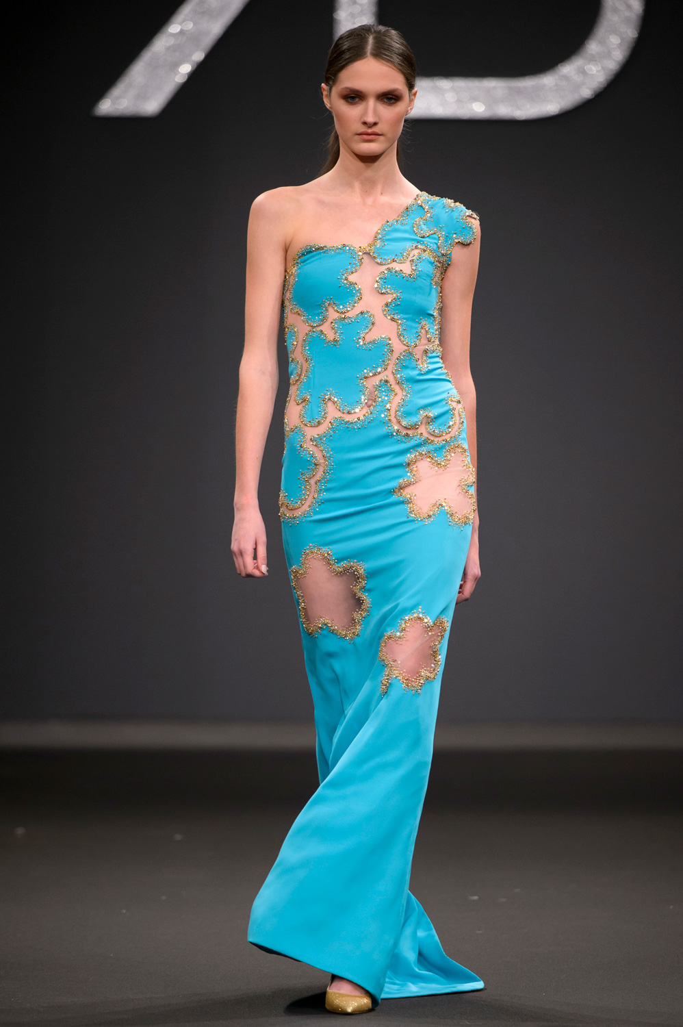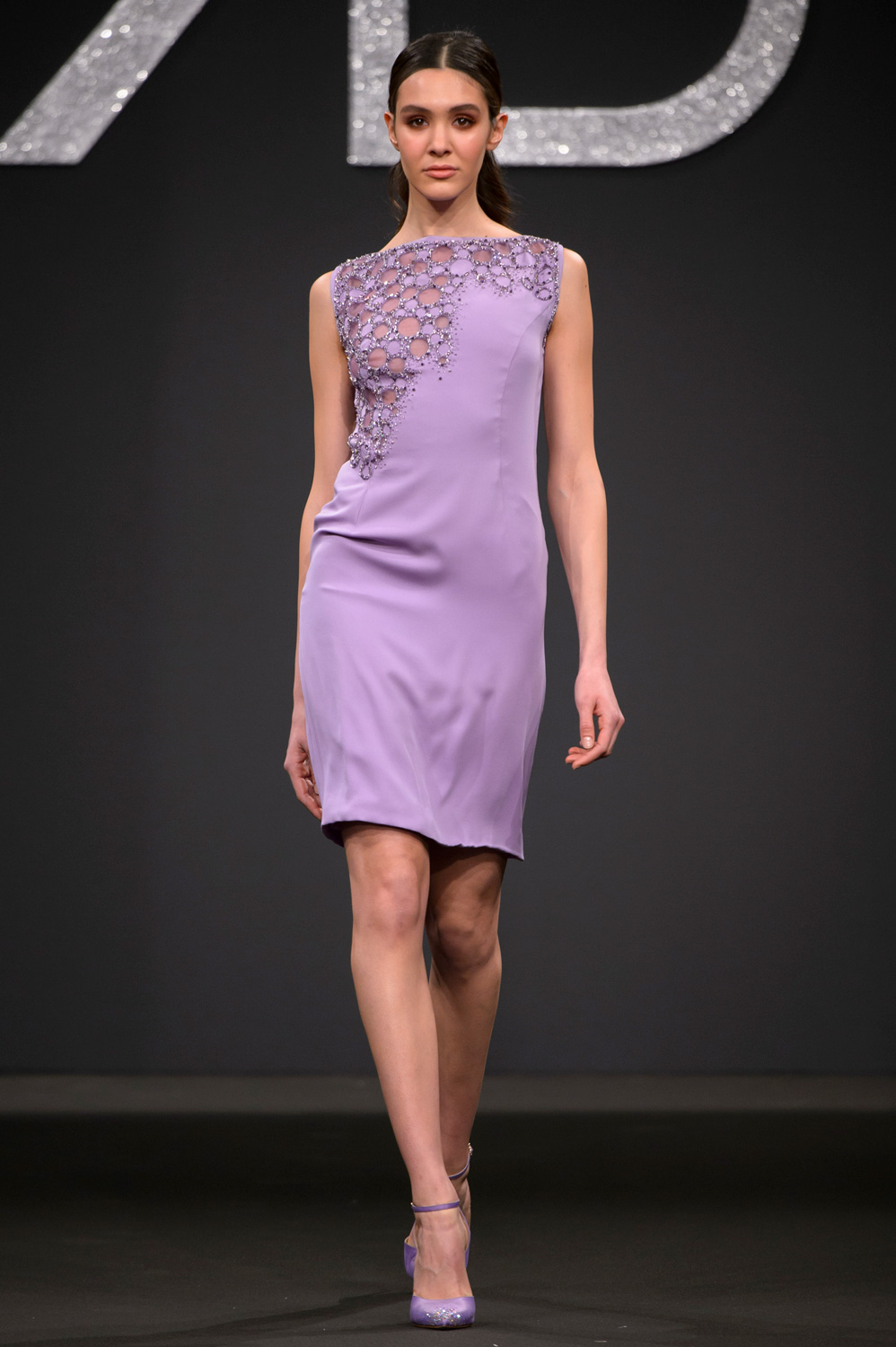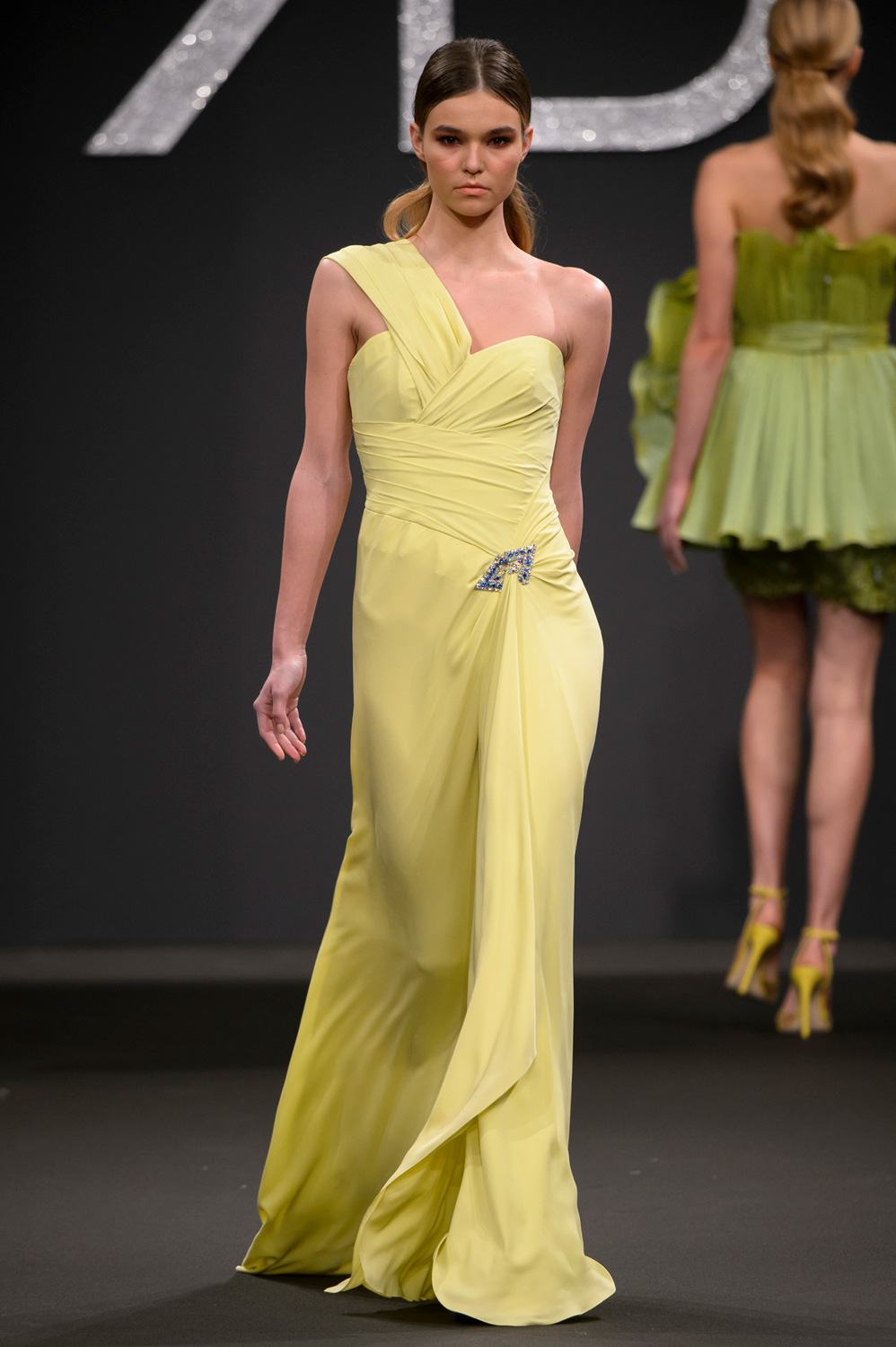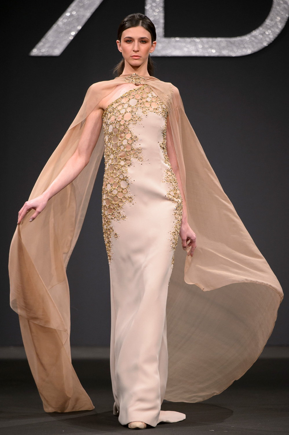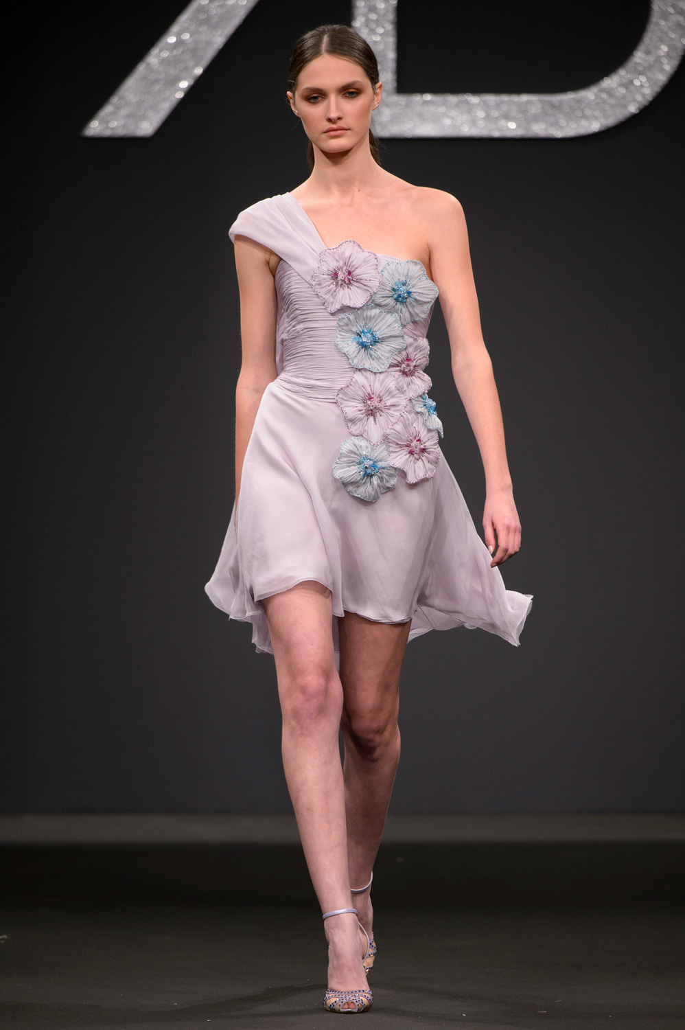 Dagli abiti al ginocchio, sia tubini con preziosi ricami che frizzanti e pieni di ruches e volants, in tenui nuance come il lilla, il giallo e il rosa cipria, fino ad arrivare a quelli da gran sera con volumi importanti e tagli iperbolici con colori più netti e decisi come l'oro e il rosso, tutto parla di armonia e poesia. Con i fiori tra i capelli, le modelle sembrano tante Venere del Botticelli in una collezione che ha entusiasmato il pubblico in sala, fino al gran finale, con una sposa dall'abito con gonna design di notevole impatto visivo.