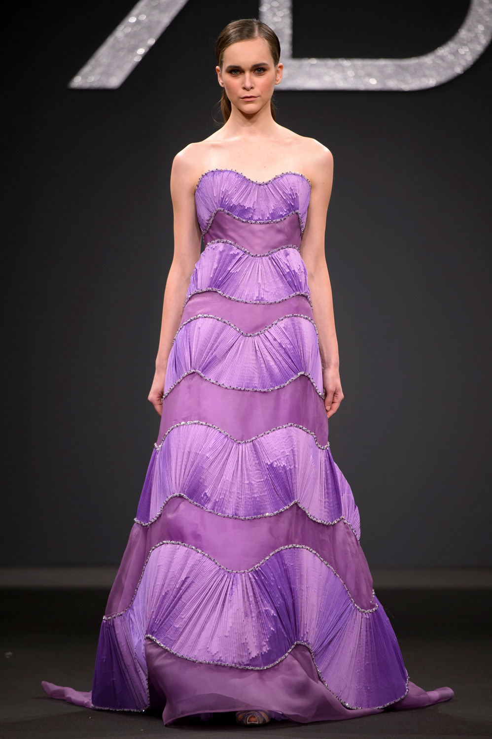 Dresses long to the knees, proposed in delicate nuances like liliac, yellow and pink powder, are available in two version: tiny and enriched by precious embroideries or absolutely sparkling with cascades of ruches and volants, while for the most important occasion the long evening dresses have a straight line and fabolous capes or majestic volumes enhanced by bold colors like red and gold.